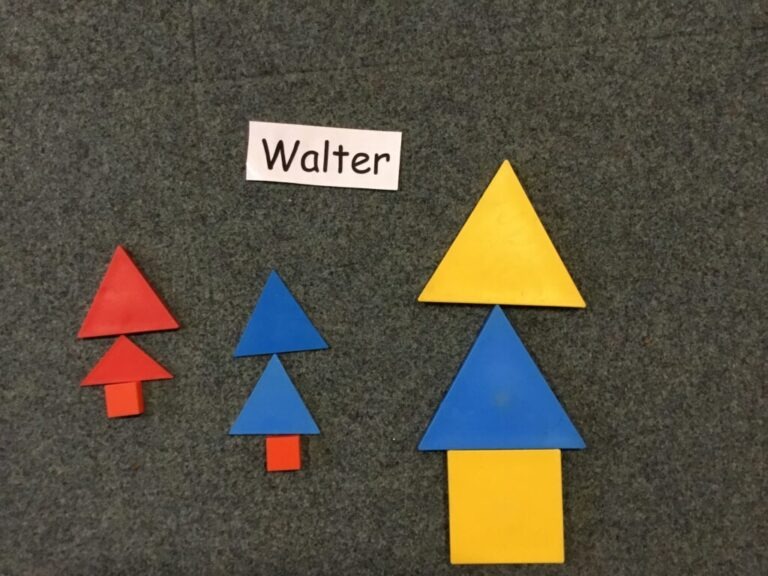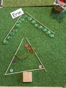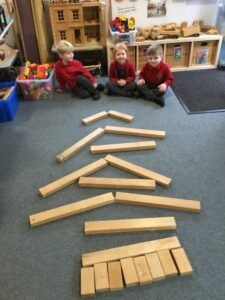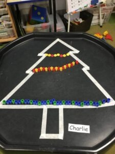 In maths, the children have been exploring shape, space and pattern. They created different Christmas trees using loose parts, funky fingers, shapes and large block play.