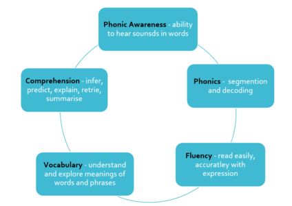 To be able to read and understand texts children need to master 5 areas. The areas of fluency, vocabulary and comprehension are taught using Talk4Reading (T4R) approaches.